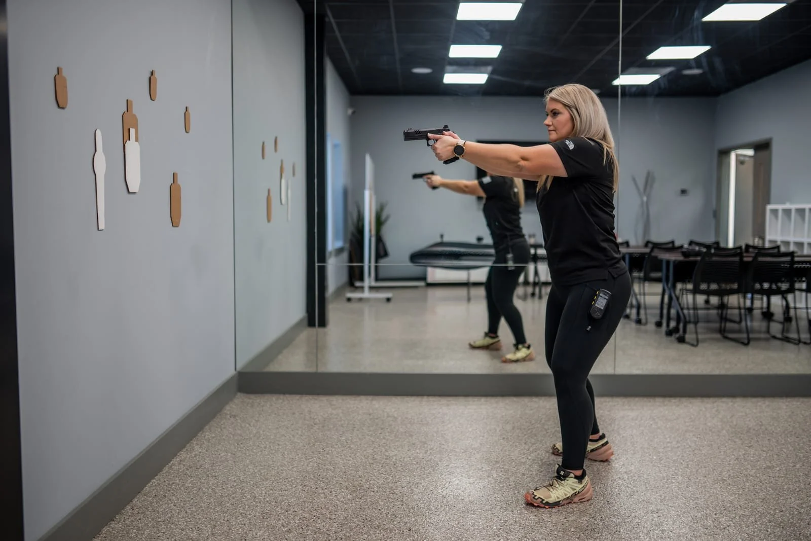 An effective drill I found to help establish a consistent and strong draw, is to stand stationary in front of one target and put the target on a mirror. Maintaining your stance, practice drawing out on the target on the mirror and forcing the gun and sights to your eyeline and where you are looking at. Something to watch for is to see if there are any “extra” movements that are inefficient for the draw such as an exaggerated rolling of the shoulder, or leaning out when drawing, or moving your head like moving it down into the gun instead of moving the gun to your eyes.